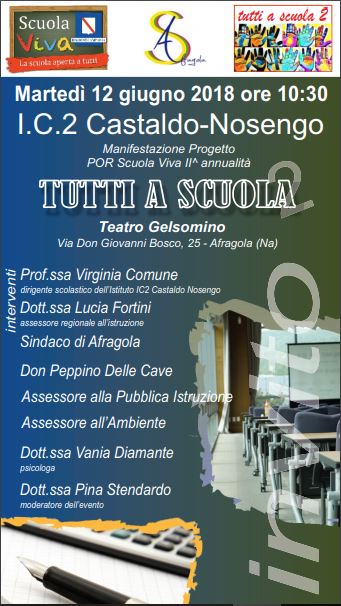 Il 12 giugno scorso ad Afragola al teatro Gelsomino, l’IC Castaldo-Nosengo ha messo in scena lo spettacolo ‘’Le avventure di Super Sacco – L’isola della spazzatura’’ a coronamento della seconda annualità del Programma Scuola Viva. Un’opera che, attraverso lo studio della raccolta differenziata e in collaborazione con i moduli di musica, ha portato gli allievi a preparare uno spettacolo proprio sull’importanza del differenziare i rifiuti e del riutilizzare gli oggetti.