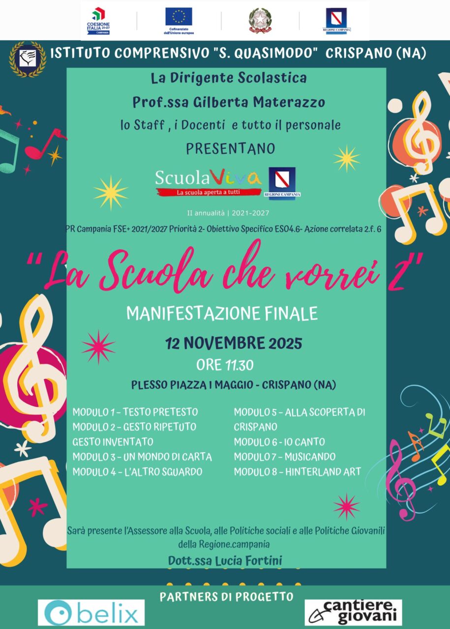 Mercoledì 12 novembre 2025, il plesso di Piazza I Maggio ha accolto famiglie, docenti, istituzioni e studenti per l’evento conclusivo del progetto LA SCUOLA CHE VORREI 2 dell’IC S. Quasimodo di Crispano nell’ambito della II annualità del Programma Scuola Viva. Un appuntamento attesissimo, che ha rappresentato il coronamento di mesi di attività laboratoriali dedicate alla creatività, all’inclusione e allo sviluppo delle competenze.