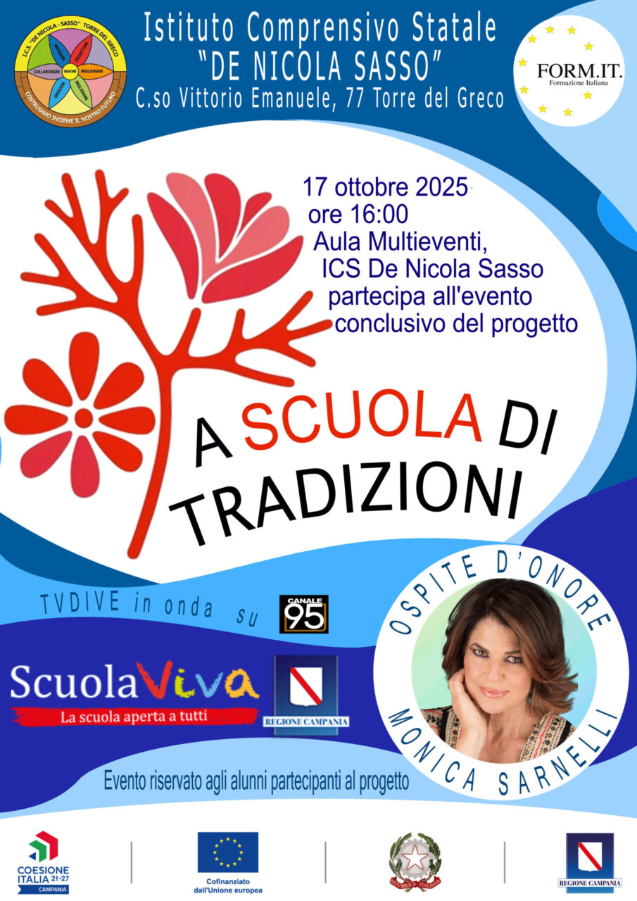 L’IC De Nicola – Sasso di Torre del Greco ha dato vita alla manifestazione conclusiva del progetto A SCUOLA DI TRADIZIONI II realizzato nell’ambito della II annualità del programma Scuola Viva. Un momento di festa e restituzione delle attività che hanno animato i laboratori. L’iniziativa rappresenta il culmine di un percorso progettuale articolato e inclusivo, pensato per favorire il benessere, la partecipazione e la crescita personale degli studenti attraverso esperienze formative diversificate e di qualità.