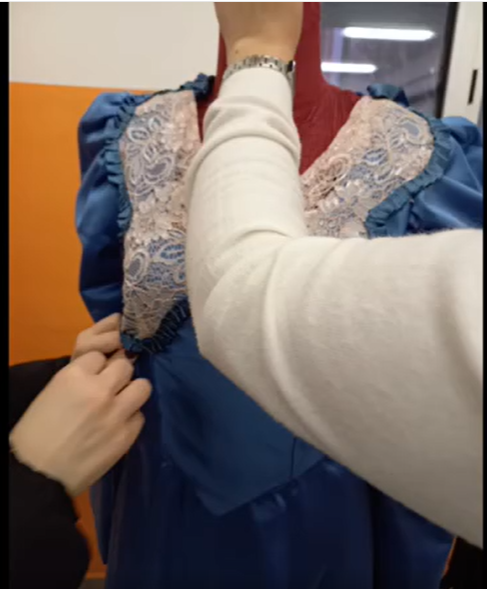 Sul piano pratico, gli studenti hanno sperimentato la progettazione e la ricostruzione di capi sartoriali, imparando a riconoscere tessuti e tecniche che storicamente caratterizzano la tradizione del costume teatrale. Il laboratorio ha richiesto rigore e precisione, poiché ogni dettaglio, una cucitura, un ricamo e un’applicazione contribuisce a definire la credibilità scenica. Tale esperienza ha offerto ai ragazzi una formazione concreta e professionalizzante, fornendo loro competenze spendibili sia nel settore moda sia nell’ambito dello spettacolo dal vivo.