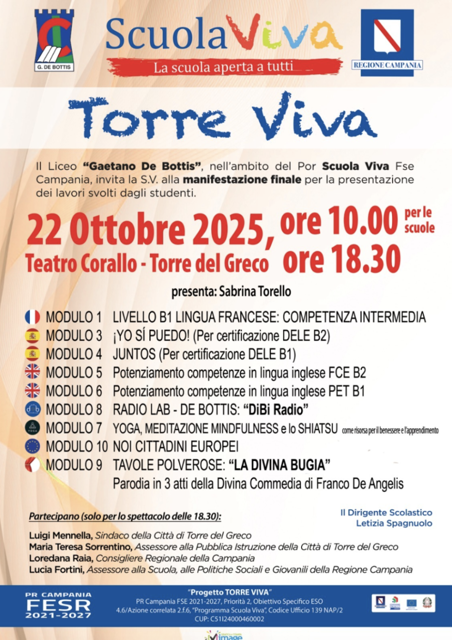 Un’esperienza educativa ricca e articolata giunge al termine al LS Gaetano De Bottis di Torre del Greco, dove si è concluso il progetto TORRE VIVA, realizzato nell’ambito della II annualità del programma Scuola Viva. Un percorso che ha coinvolto centinaia di studenti, offrendo un’alternativa concreta alla didattica tradizionale attraverso attività laboratoriali e formative mirate allo sviluppo delle competenze e alla crescita personale.