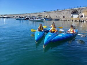 In parallelo, il progetto ha sviluppato i moduli IN CANOA PER CONOSCERE L’AMBIENTE DA A…MARE, pensati per approfondire il rapporto tra attività motoria e tutela dell’ambiente marino e costiero. L’esperienza in canoa ha favorito un contatto diretto con il territorio, consentendo ai partecipanti del modulo di osservare l’ecosistema marino e di riflettere sull’importanza della sua salvaguardia. Il movimento lento e controllato della canoa ha allenato le competenze di controllo e guida del mezzo, allenando nei ragazzi capacità di lettura della dinamica marina fondata sull’esperienza concreta piuttosto che su concetti astratti.